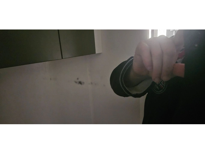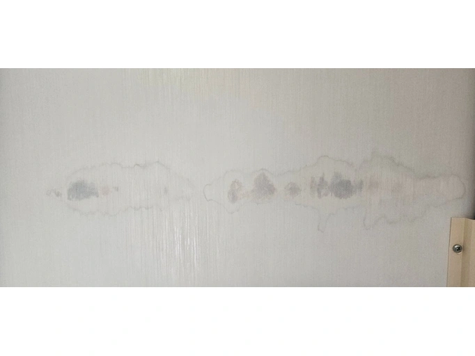 Zelf gerepareerde waterschade aan de bumperstrip op de linker zijwand, opgemerkt en gerepareerd in 2025. Watervlekken zijn zichtbaar binnenin Foto's ingesloten. Roestvlek op de spiegel als gevolg.