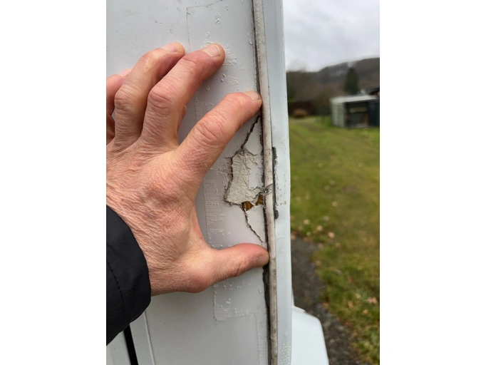 Linksachter ca. 15 cm verticale scheur op de rand van de GRP romp. Keiun waterschade.